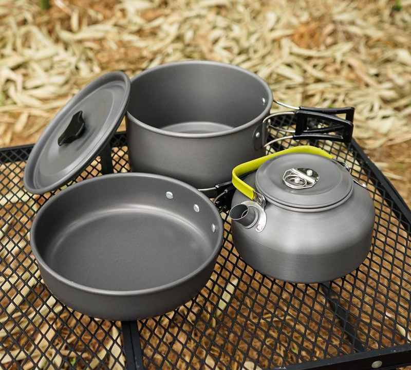Набір туристичного, похідного посуду з анодованого алюмінію для використання з різного роду пальниками і примусами. У набір входять: казанок (каструля) з кришкою, одна містка сковорідка, чайник. Весь посуд оснащений складними ручками-метеликами з ізоляцією (щоб не обпекти руки).Весь комплект ховається в сітчастий чохол, складається дуже компактно.