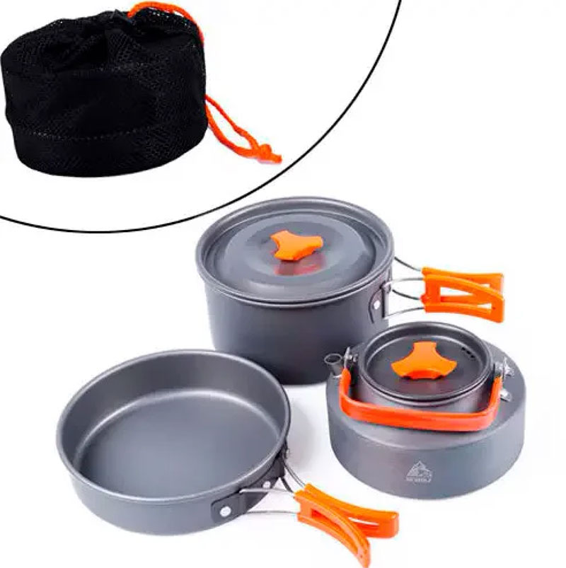Набір туристичного, похідного посуду з анодованого алюмінію для використання з різного роду пальниками і примусами. У набір входять: казанок (каструля) з кришкою, одна містка сковорідка, чайник. Весь посуд оснащений складними ручками-метеликами з ізоляцією (щоб не обпекти руки).Весь комплект ховається в сітчастий чохол, складається дуже компактно.