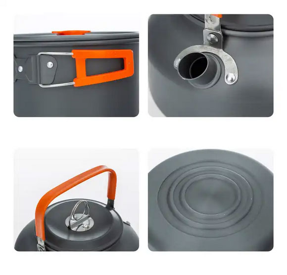Чайник об'ємом 1,1 л дозволить отримати насолоду від свіжого чаю або кави і зігрітися в подорожі. Каструля на 2 л та сковорідка діаметром 18 см і заввишки 4,5 см виконані з зручними ручками, які не будуть нагріватися так сильно як метал.